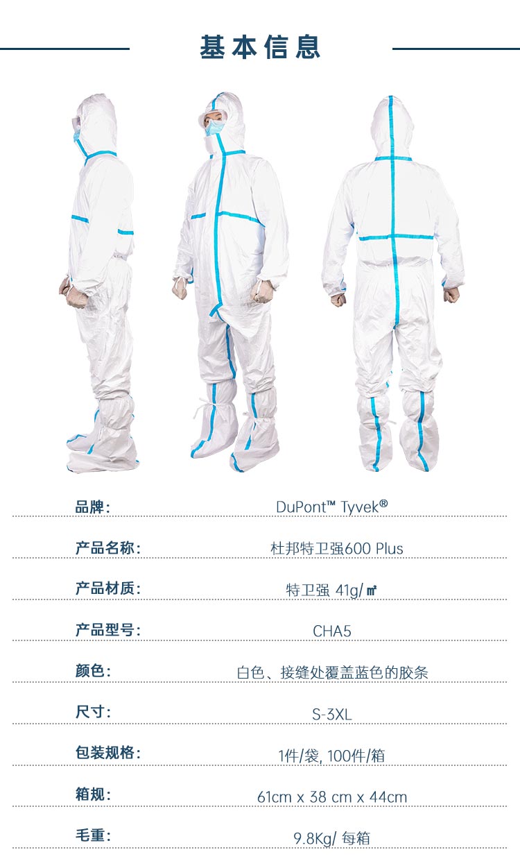 品牌:  杜邦? Tyvek?; 產(chǎn)品名稱:杜邦? Tyvek? 600 Plus; 產(chǎn)品材質(zhì):TYVEK 41g/㎡; 產(chǎn)品型號(hào): CHA5; 顏色:白色、接縫處覆蓋藍(lán)色的膠條; 尺寸:S-3XL; 包裝規(guī)格:1件/袋, 100件/箱; 箱規(guī): 61cm x 38 cm x 44cm; 毛重:9.8KG/ 每箱。
